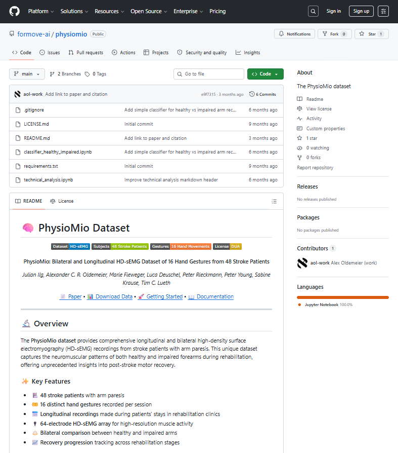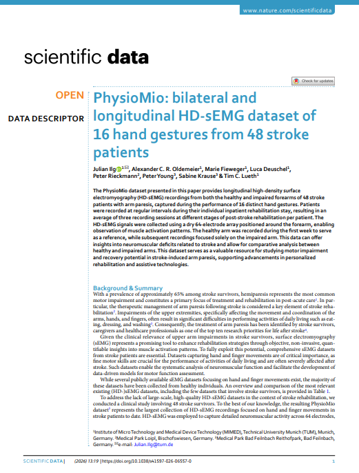 - Ilg, J., Oldemeier, A.C.R., Fieweger, M. et al. PhysioMio: bilateral and longitudinal HD-sEMG dataset of 16 hand gestures from 48 stroke patients. Sci Data 13, 19 (2026). https://doi.org/10.1038/s41597-026-06557-0